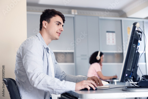 People working at desks in library, selective focus