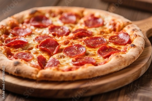 Pepperoni pizza displayed on a wooden board, capturing its delicious and inviting appearance.