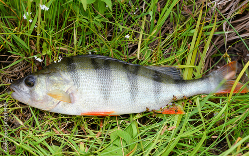 Perch on the green grass. Perch - freshwater fish.Bass river fish/Perch - freshwater fish on green grass background