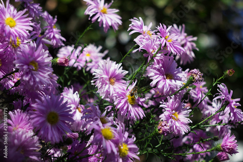 Perennial Aster - flowering lilac autumn flowers with bee in the garden background
