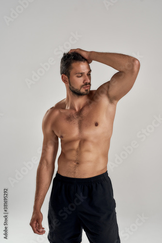 Perfect body. Young muscular caucasian man showing his naked torso while posing shirtless isolated over grey background