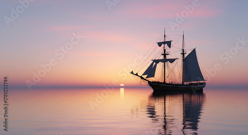 Perfect Sunset Voyage: Classic Tall Ship on Glassy Water