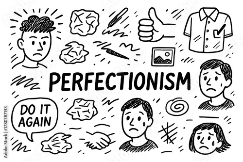Perfectionism psychology concept with stress, self criticism, and retry cycle symbols in black and white doodle style, Transparent Background