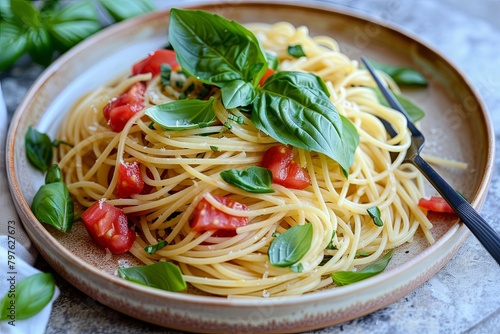Perfectly Aligned Pasta Spaghetti: Anticipating Fresh Basil and Tomato Served on Ceramic Plate