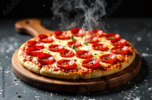 Perfectly baked pepperoni pizza fresh from the oven on a wooden board