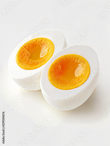 Perfectly cooked soft-boiled eggs with a rich golden yolk on a plain surface