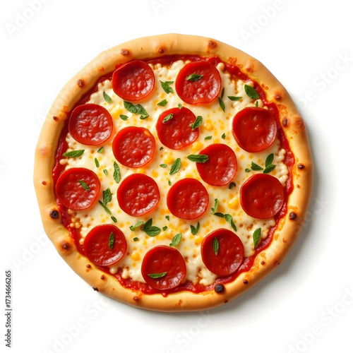 Perfectly Isolated Whole Pepperoni Pizza with Fresh Herbs on a White Background, Top View Classic Studio Shot of a Complete Round Pepperoni and Mozzarella Pie with Golden Crust