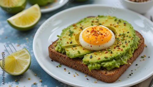 Perfectly ripe avocado slices on whole-grain toast, sprinkled with chili flakes and sesame seeds, A soft-boiled egg and a wedge of lime are served on the side for a vibrant and healthy presentation.
