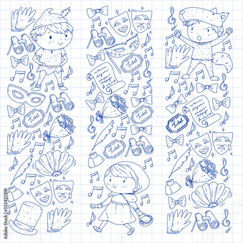 Perfomance, theatre with little children. Kindergarten kids in fairy tale scenes. Young actors perfoming Red Riding Hood and Shakespeare Hamlet. Robin hood costume.