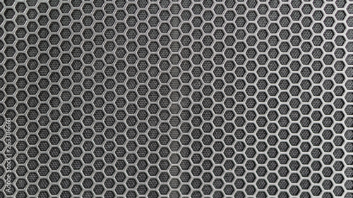 Perforated metal texture, metallic backdrop, acoustic speaker grill surface