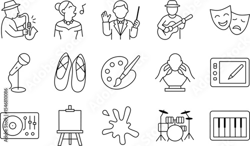 Performing and Creative Arts Stroke Icon Collection. Containing Music, Dance, Theater, Painting, and more. Editable Outline Vector Icons Set.