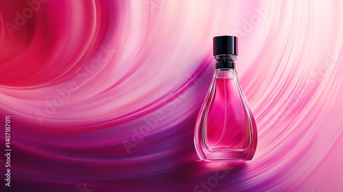 perfume product display featuring a clear glass bottle with a black cap placed beside a vibrant pink swirl on a table representing sophistication and visual elegance