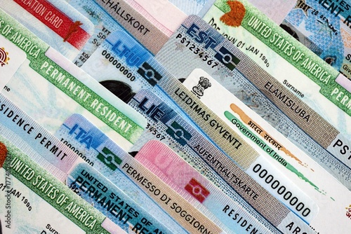 Permanent resident or residence permit cards of different countries in very big amount. Specimen cards close up