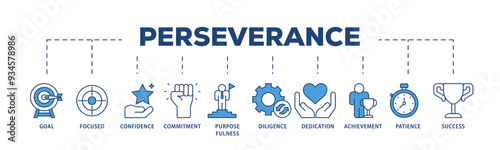 Perseverance icons process structure web banner illustration of goal, focused, confidence, commitment, purposefulness, diligence, dedication, achievement icon png transparent background.