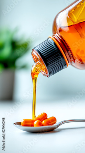 persistent cough illness condition concept. Pouring liquid from bottle onto orange capsules, showcasing health products