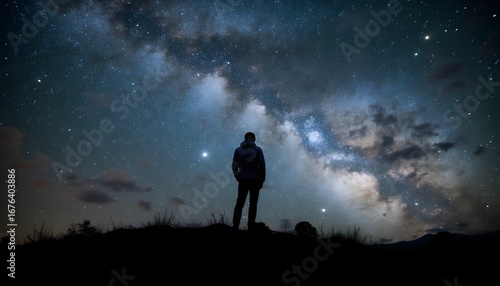 Person Admiring Starry Night Sky with Milky Way and Cosmic Clouds in Background
