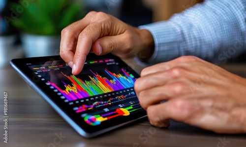 Person Browsing Financial News Articles on a Digital Tablet Surrounded by Stock Market Data