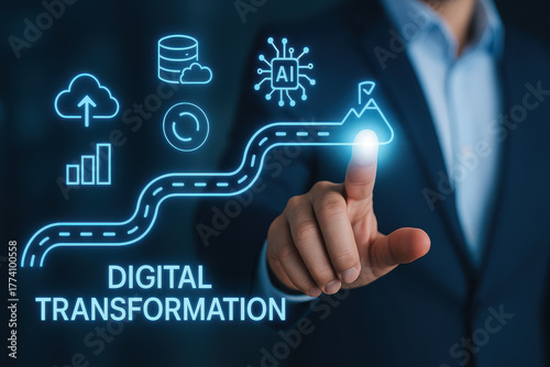 Person business suit interacts with digital interface showcasing concepts of digital transformation, including cloud computing, data analysis, and artificial intelligence. image conveys innovation