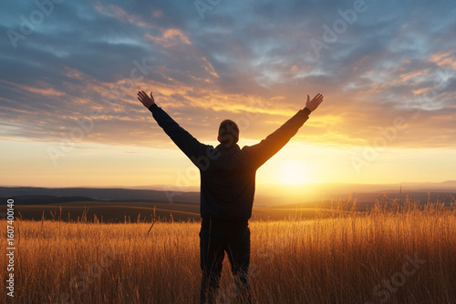 Person celebrates victory with arms raised at sunset in nature