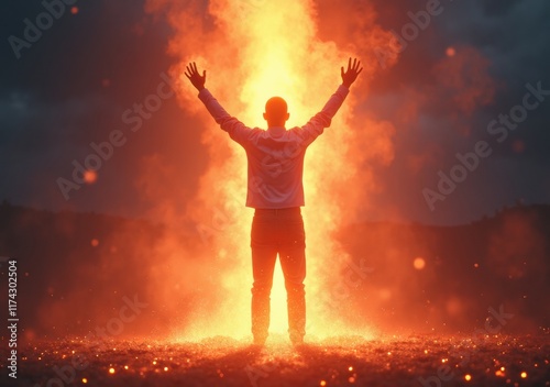 Person celebrating joyfully with arms raised in front of dramatic fiery backdrop at sunset