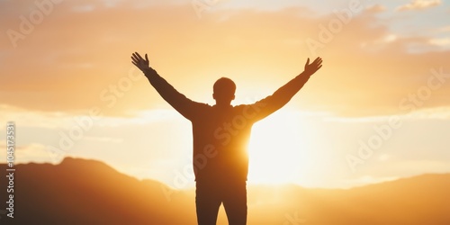 Person celebrating under a sunset, silhouette against vibrant sky.