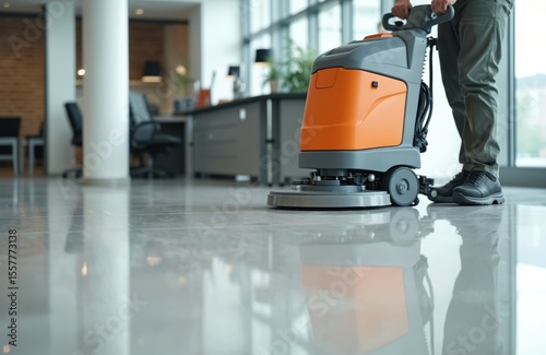 Person cleans office floor using high-speed machine. Modern tech, worker detail. Maintaining cleanliness, hygiene. Floor care service, industrial floor cleaner for commercial buildings. Pro cleaning