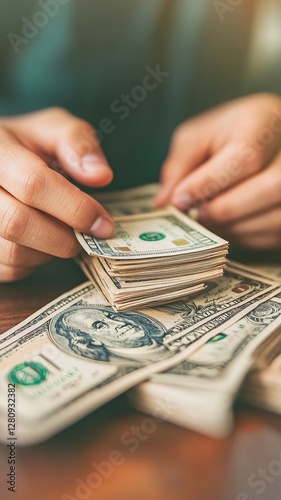 Person Counting a Stack of One Hundred Dollar Bills Close Up View of Hands and Cash