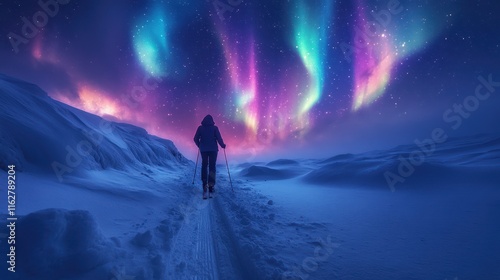Person cross-country skiing at night under vibrant aurora borealis in snowy landscape.