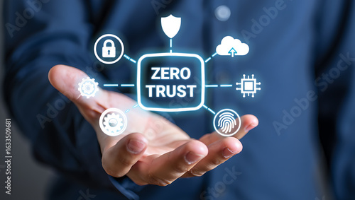 Person displaying digital security concept with icons trust technology