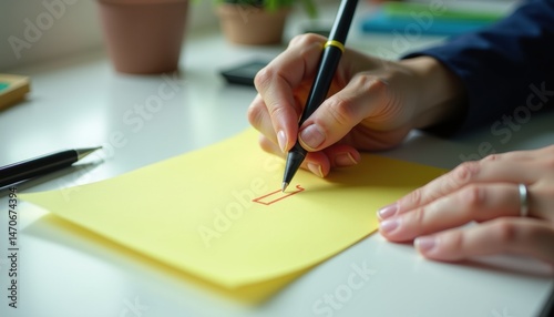 Person drawing a box on yellow paper at a desk