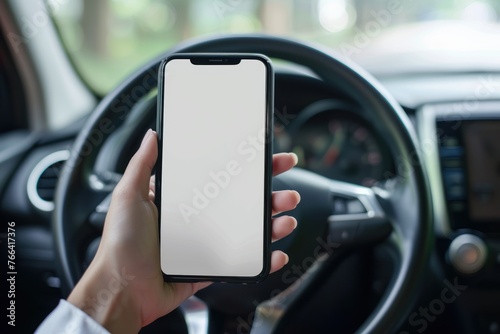 person Driver holding phone white screen on steering wheel background