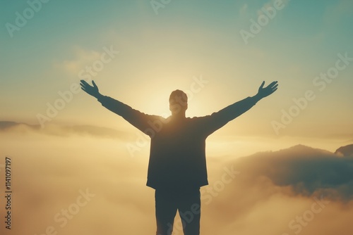 Person enjoying a breathtaking sunrise atop a mountain, embracing the beauty of nature and tranquility