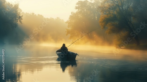 Person fishing alone in a small boat on a misty lake with autumn trees and soft sunlight. Ideal for concepts of solitude, nature, peacefulness, and early morning activities.