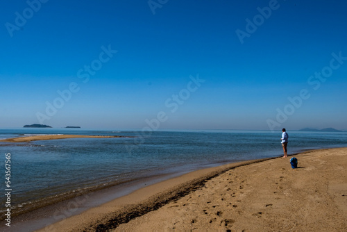 Person fishing on Cowley Beach, Cassowary Coast, Queensland, Australia. There is a vast expanse of beach, ocean and horizon