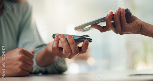 Person, hands or pos machine with phone for payment, electronic transaction or tap. Closeup, therapist or patient paying with mobile smartphone for app, mobile reader or wireless banking at checkout