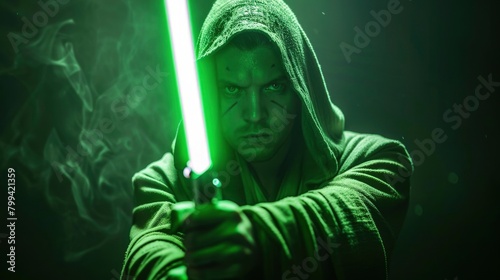 Person holding a lightsaber, invoking a sci-fi fantasy theme.
