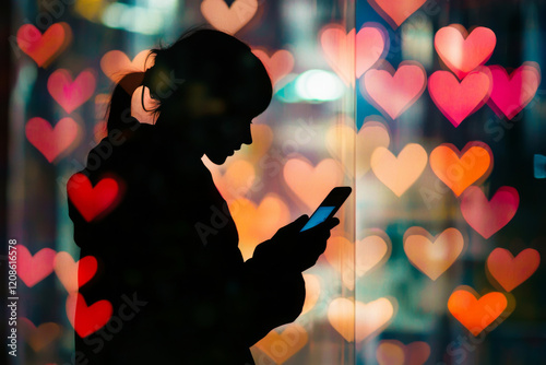 Person holding a phone while standing against a colorful heart bokeh background at night