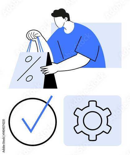 Person holding a shopping bag with discount sign, gear symbolizing settings, and checkmark for approval or success. Ideal for retail, e-commerce, sales, deals, process optimization, shopping
