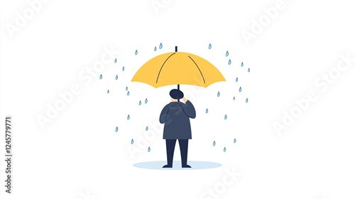 Person holding a yellow umbrella in the rain, standing on a light blue surface, serene atmosphere