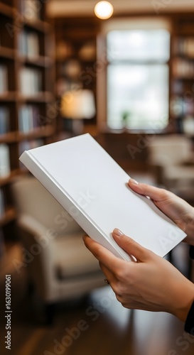 Person Holding Blank Book in Cozy Library Room with Wooden Shelves and Large Window Mockup