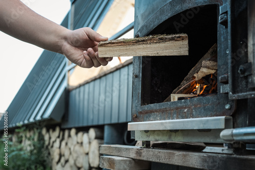 Person holding chopped firewood near an outdoor black metal stove with a burning fire inside, located on a wooden terrace near a modern cabin