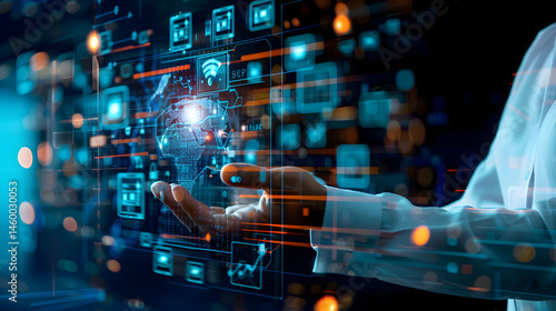 Person holding digital globe with glowing icons in a futuristic interface setting
