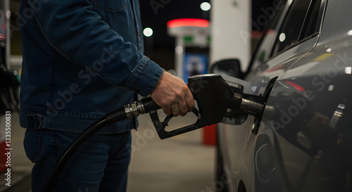 Person holding fuel nozzle while refueling vehicle at gas station during nighttime. Automotive service concept