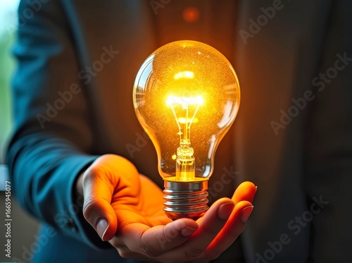 Person Holding Glowing Light Bulb in Hands in Dark Room Interior
