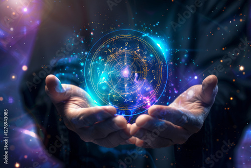 Person holding glowing zodiac wheel in hands hands surrounded by cosmic energy and starry lights. Concept of astrology, esoteric horoscope and future prediction