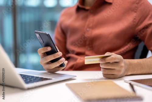 Person holding phone and credit card while using laptop at office desk. Concept of online shopping, e-commerce, technology in business.
