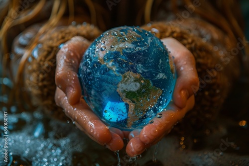 Person holding small globe with water stream