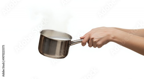 Person Holding Steaming Milk in Stainless Steel Saucepan on White Background Real Shot Photography