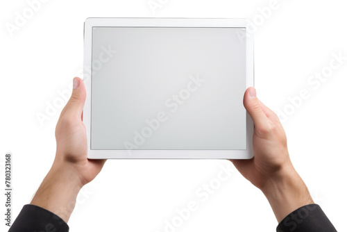 Person Holding Tablet in Hands. On a White or Clear Surface PNG Transparent Background.