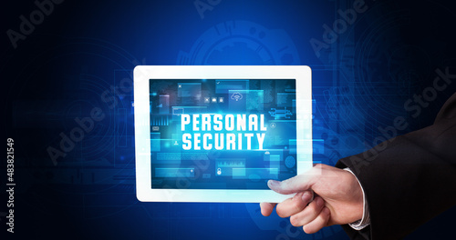 Person holding tablet, security concept